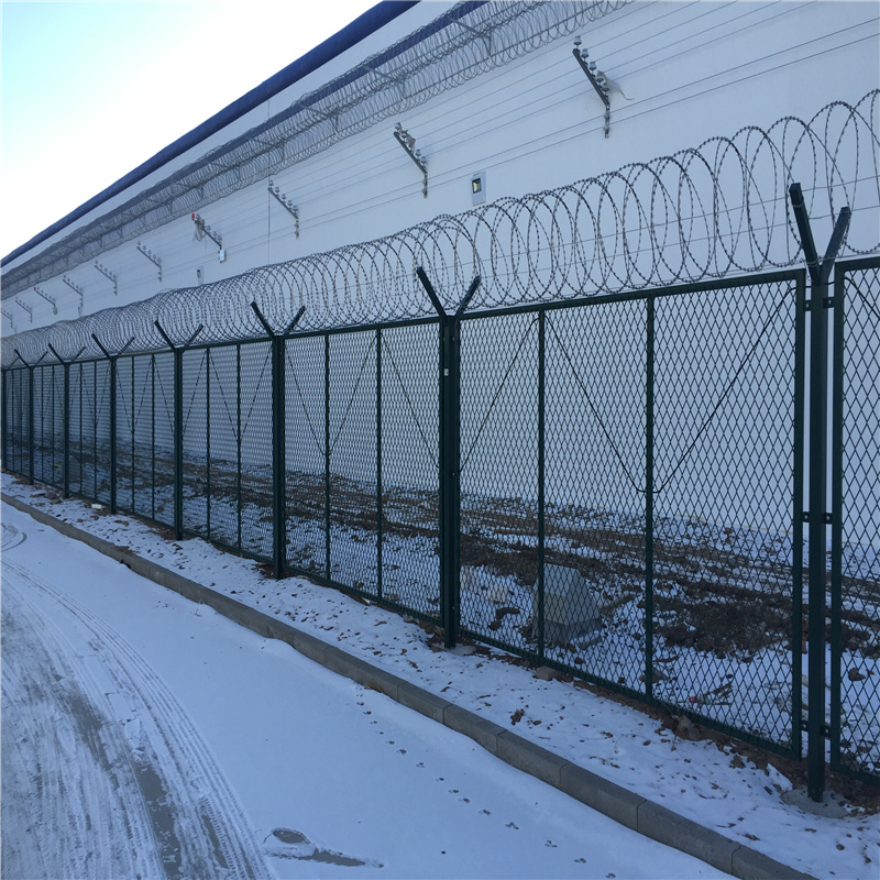 監(jiān)獄鋼網(wǎng)墻刀刺網(wǎng)片菱形孔要求豎向排列,網(wǎng)頁緊固牢靠、平整美觀,每單元網(wǎng)頁每側(cè)不少于六個(gè)連接固定點(diǎn)。蛇腹式刀刺網(wǎng)每圈刀刺間隔100mm,每米刀刺不少于10圈。刀刺網(wǎng)安裝固定卡扣整體調(diào)正,使刀刺網(wǎng)不出現(xiàn)擰轉(zhuǎn)情況,刀刺刺圈分布均勻,每隔20米與拉絲固定;分段連接處需將兩端刀刺網(wǎng)做連接固定,刀刺網(wǎng)固定點(diǎn)需緊鎖不得出現(xiàn)松動(dòng)、脫落現(xiàn)象;刀刺網(wǎng)安裝與隔離網(wǎng)平行,上下左右均成直線延伸,轉(zhuǎn)角處需做加密加固處理。