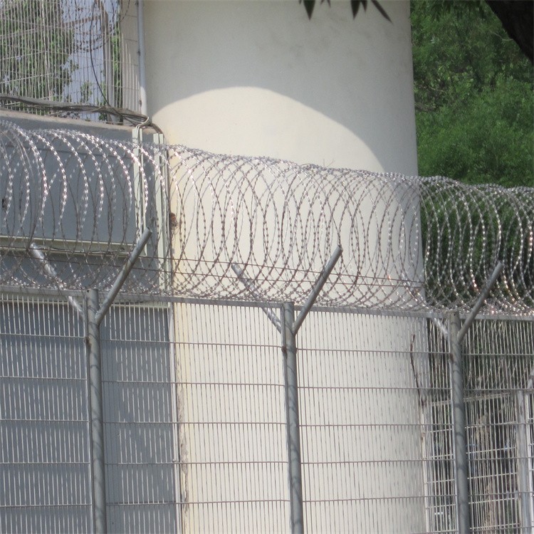 形刀刺網(wǎng)固定在鋼網(wǎng)墻頂部,從而有效的增加監(jiān)獄鋼網(wǎng)墻的防攀爬性和安全性。V型支架加裝防拆卸刀刺網(wǎng)。刀刺網(wǎng)的直徑-般為