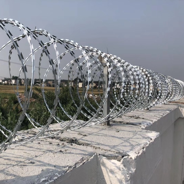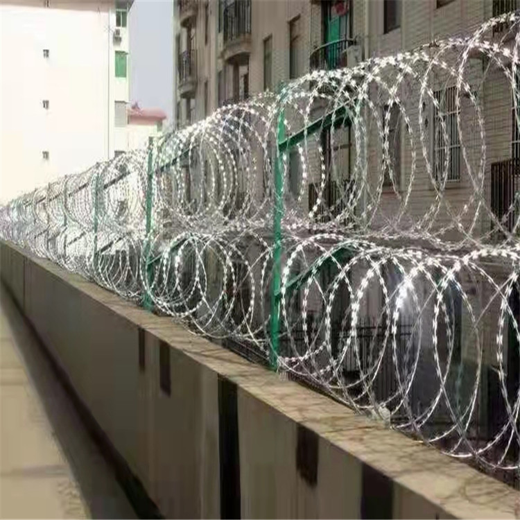 刺絲滾籠的上鋅量是有特殊要求的,現(xiàn)在市面上銷售的基本上都是每平米40-50克的上鋅量的普通產(chǎn)品,高鐵上面應(yīng)用的話一般環(huán)境選用的是120克上鋅量,特殊環(huán)境選用的是250克甚至是270克以上的產(chǎn)品,無(wú)論是板材還是里面包裹的內(nèi)絲都必須保證這個(gè)上鋅量--星宇刺繩廠15075898878。 (1)、刺絲滾籠采用刀片刺繩繞圈后相臨兩圈每隔120°用刺絲連接卡固定,張開(kāi)后形成蛇腹網(wǎng)狀,閉合后刀片刺繩圈徑為50cm,張開(kāi)后每交叉圈安裝間距20cm,直徑不小于45cm。(2)、刀片刺繩由沖切鋼板采用機(jī)械壓軋?jiān)阡摻z上成型,刀刺寬度22mm,兩刃垂直間距15mm,刀刺縱向間距34mm,芯絲直徑為2.5mm。刀片采用厚度0.5mm的Q195鋼板沖切制作,芯絲由HPB300?6.5mm高線鋼絲加工。(3)、刺絲滾籠由刺絲連接卡扣與固定在支架上的縱向拉筋相連接,縱向拉筋與支架的連接采用?2.5mm的冷拔鍍鋅鋼絲繞2圈后擰緊固定,支架設(shè)置在跨度3m防護(hù)柵欄的立柱和跨中位置,其他跨度僅設(shè)置與立柱上部,支架與防護(hù)柵欄采用支架抱箍連接。(4)、刺絲滾籠的下緣距離鋼筋混凝土防護(hù)柵欄上緣的垂直距離為0.05m。