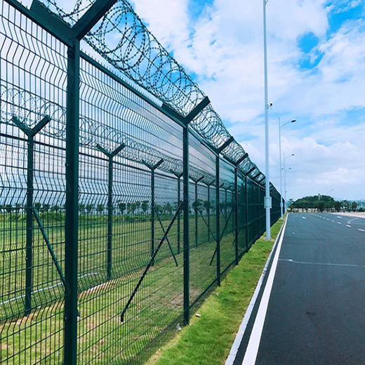機(jī)場(chǎng)護(hù)欄和監(jiān)獄護(hù)欄樣式基本上是一類的,上面是Y型架托著刀片刺繩,下面是護(hù)欄網(wǎng)片,