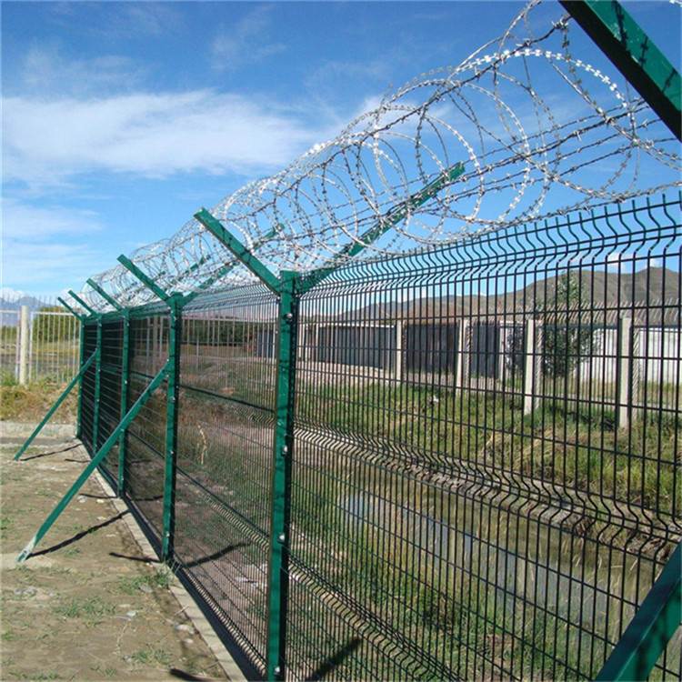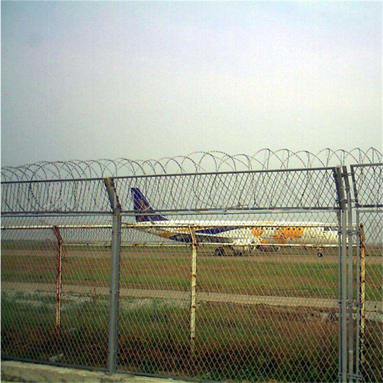 機場圍界網頂部加裝刀片刺絲、刀片刺網后又很好的增強了安全防護性能。其產品造型美觀、花色多樣,既起到圍欄作用,又起到美化作用。由于具有安全性高、防攀爬能力好網片連接方式采用特制SBS緊扣件,有效防止人為的破壞性拆卸,橫向四道折彎加強筋,使網面強度顯著增加。
