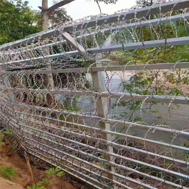 直條型刀片刺網(wǎng)表面防腐處理有電鍍鋅、熱鍍鋅以及鍍鋅噴塑(顏色隨意選擇),根據(jù)客戶的要求,做不同的處理。其主要用于監(jiān)獄護(hù)欄網(wǎng)、軍事護(hù)欄網(wǎng)、機(jī)場(chǎng)護(hù)欄網(wǎng)、小區(qū)防盜網(wǎng),與其他護(hù)欄網(wǎng)相結(jié)合防護(hù)作用會(huì)更佳。
