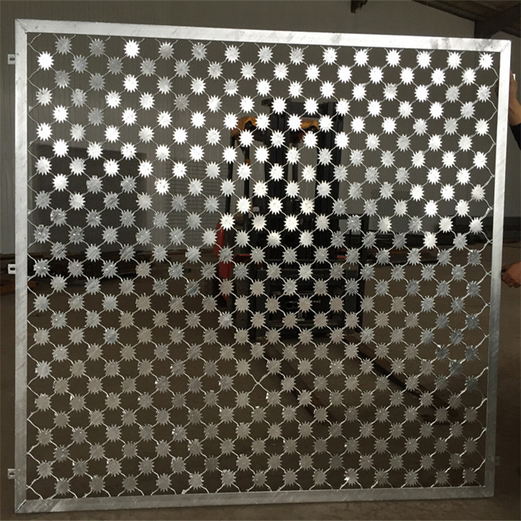 梅花刺鋼網(wǎng)墻規(guī)格尺寸:2.24*1.63米、1.63*163米、3.34*2.24米、3.34*1.02米、3.34*1.63米等不同規(guī)格、絲經(jīng)不低于60O#。梅花刺鋼網(wǎng)墻立柱采用Y型鍍鋅鋼管:壁厚150*150*8mm /網(wǎng)片邊框60*60*2.5m、Y型立柱安裝不銹鋼刀片刺網(wǎng)。
