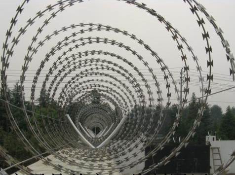 刀片刺繩的刀片是由尖利的鍍鋅鋼或不銹鋼制成。支架由相同規(guī)格的矩形鋼管制成。穿插環(huán)安裝相距20厘米,直徑至少為45厘米。刀片采用0.5mm厚Q195鋼板進(jìn)行模切,芯線為HPB300;采用6.5mm高線另一個跨度僅在列的頂部提供,并且支架和防護(hù)圍欄經(jīng)過支架環(huán)銜接。