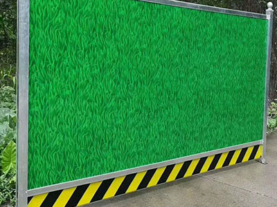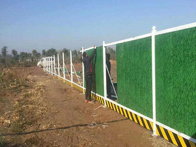 圍擋基腳采用M10水泥砂漿砌筑MU10頁(yè)巖磚磚砌0.5*0.5的基礎(chǔ),用于增強(qiáng)圍擋抗風(fēng)穩(wěn)定性;pvc圍擋設(shè)2.5米高,寬3米為一板。施工圍擋做美化處理,噴涂企業(yè)名稱、安全、質(zhì)量、文明施工用語(yǔ)及開發(fā)項(xiàng)目商業(yè)廣告,嚴(yán)禁張貼、涂寫垃圾廣告。