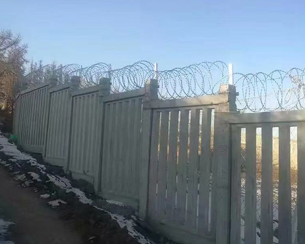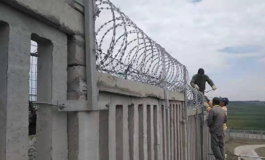 刀片刺繩采用刀片刺繩繞圈后相鄰兩圈每隔120度用刺絲連接卡固定,張開后形成蛇腹網(wǎng)狀,閉合后刀片刺繩卷徑為50cm,張開后每交叉圈安裝間距20cm,直徑不小于45cm。刀片刺繩由刺絲連接卡扣與固定在支架上的縱向拉筋相連接,縱向拉筋與支架的連接采用Φ2.5mm的冷拔鍍鋅鋼絲繞2圈后擰緊固定,支架(土字支架)設置跨度3m,中間需增加一個加密支架(一字支架),支架與防護柵欄采用支架抱箍連接,對于已經(jīng)安裝金屬網(wǎng)片的防護柵欄,刀片刺繩直接采用Φ2.5mm的冷拔\鍍鋅鋼絲或刺絲連接卡扣固定于金屬網(wǎng)橫片和金屬絲上。