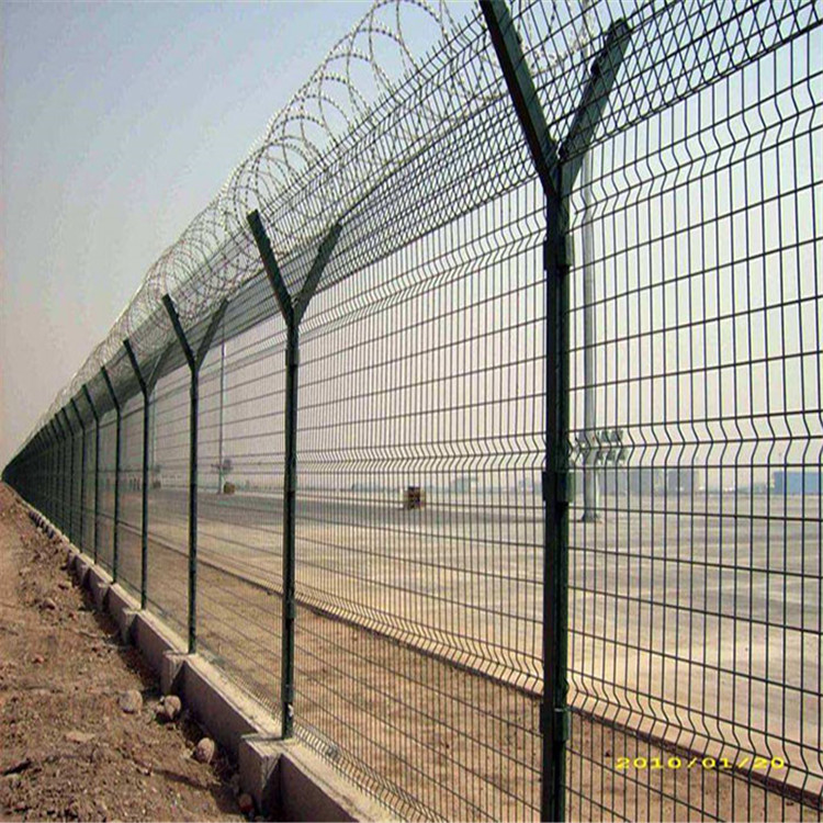 機(jī)場圍界又稱作“Y型安全防御護(hù)網(wǎng)”,是由V型支架立柱加強(qiáng)型焊接片網(wǎng),安全防盜連接件和熱鍍鋅刀片刺網(wǎng)組成強(qiáng)度和安全防御性級別很高。被廣泛應(yīng)用在機(jī)場,軍事基地等高安全場所。