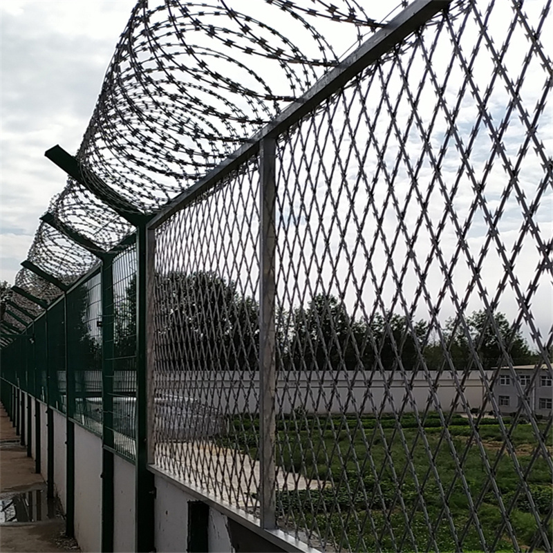 監(jiān)獄刀片刺隔離網(wǎng)由銳利尖角鍍鋅鋼板或不銹鋼薄板做刀片,高張力鋼絲做芯線組合而成的阻絕器材。刀刺網(wǎng)焊接網(wǎng)片由刀片型直線刺網(wǎng)交叉焊接成型。刀片刺網(wǎng)的制作工藝并不是非常困難,只要具有特殊的機械和熟練的生產(chǎn)技術(shù)都可以生產(chǎn)出完美的刀片刺網(wǎng)。監(jiān)獄刀片刺隔離網(wǎng)作為監(jiān)獄隔離網(wǎng)使用時,其邊框和立柱的選材也需要比其他場合使用時標準更高。已到達更好地防護效果。