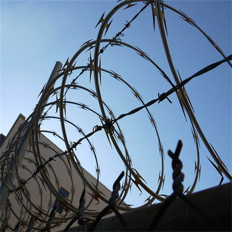在監(jiān)獄中,蛇腹形刀刺網(wǎng)更多的是和鋼網(wǎng)墻、隔離網(wǎng)結(jié)合使用。在鋼網(wǎng)墻、隔離網(wǎng)的立柱上設(shè)置好Y型支架,支架的大小根據(jù)蛇腹形刀刺網(wǎng)的規(guī)格來(lái)決定。在安裝時(shí)廠家會(huì)配套專用的拉絲(或者V網(wǎng))、卡扣、專用鉗子等工具,安裝師傅將拉線拉緊的同時(shí)把刀刺網(wǎng)成卷、等距的放到Y(jié)型立柱上,將拉絲固定好后開(kāi)始拉伸刀刺網(wǎng),拉伸的同時(shí)將刀刺網(wǎng)與拉絲用卡扣進(jìn)行固定。一般每米用卡扣5-6個(gè)。
