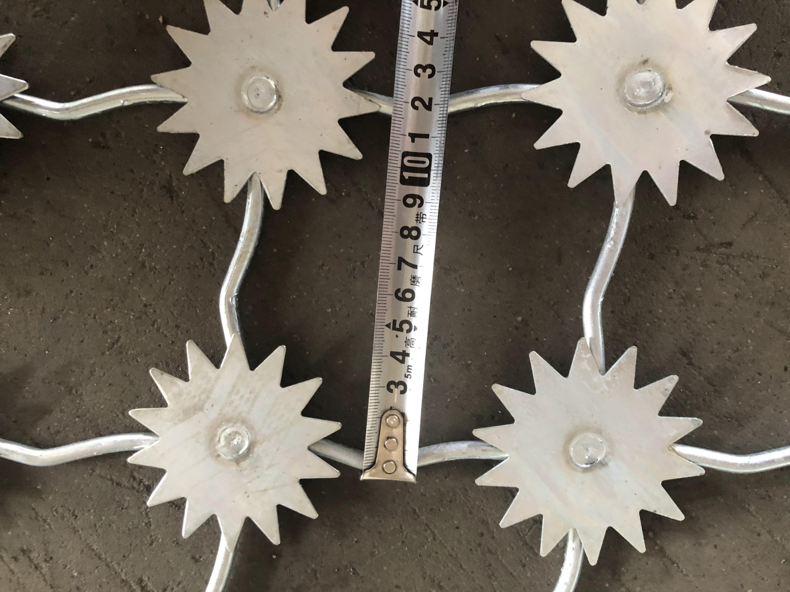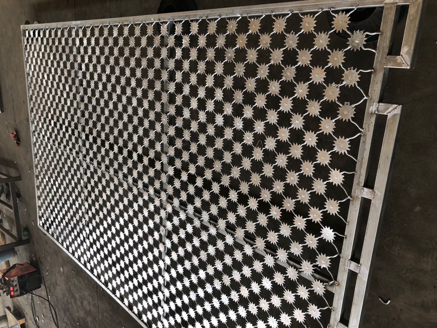 梅花刺片隔離網(wǎng)梅花剌防攀爬隔離網(wǎng)、梅花剌隔離網(wǎng)連接、緊固件應采用防盜專用螺栓(螺母)加彈簧墊,安裝固定后無專用工具無法拆卸,安裝配件均采用熱鍍鋅處理。
