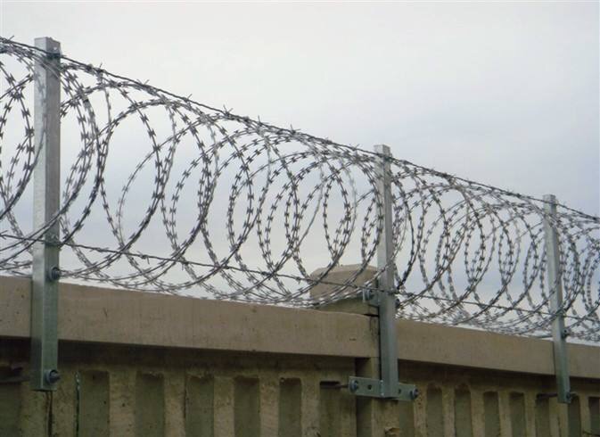 鐵路防爬刺又稱鐵路刺絲滾籠,安裝由土字支架、一字加密支架、抱箍組成,鐵路刀刺網(wǎng)支架-刺絲滾籠 土字支架 定做角鋼折彎柱,鐵路刺絲滾籠新建鐵路時(shí)速200公里以上,采用2.2米高度鋼筋混凝土防護(hù)柵欄+0.5米刺絲滾籠,設(shè)計(jì)時(shí)速200公里以下鐵路,一般地段采用1.8米高度鋼筋混凝土防護(hù)柵欄+0.5米刺絲滾籠,刺絲滾籠采用刀片刺繩繞圈后相鄰兩圈每隔120°用鐵絲連接卡固定,張開后形成蛇腹網(wǎng)狀,閉合后刀片刺繩圈徑為50cm,張開后每交叉圈安裝間距20cm,直徑不小于45cm,刺絲滾籠下緣距離鋼筋混凝土防護(hù)柵欄上緣的垂直距離為0.05米。