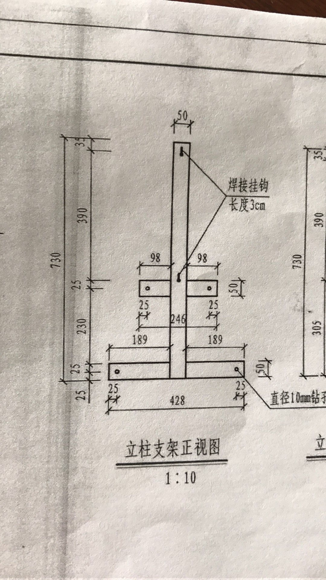 土字支架采用50mmx30mm,壁厚2mm高度是730mm、q235矩形鋼管和寬50mm,厚度4.5mm,長度分別為246mm和428mm的兩塊Q235鋼板焊接制作,矩形鋼管上部焊接掛鉤采用長度30mm的φ5mm鋼筋制作,加密支架采用50mmx30mm壁厚2mmQ235矩形鋼管制作。縱向拉筋、冷拔鋼絲、支架抱箍、支架等均需要熱鍍鋅處理,鍍鋅量270克/㎡。