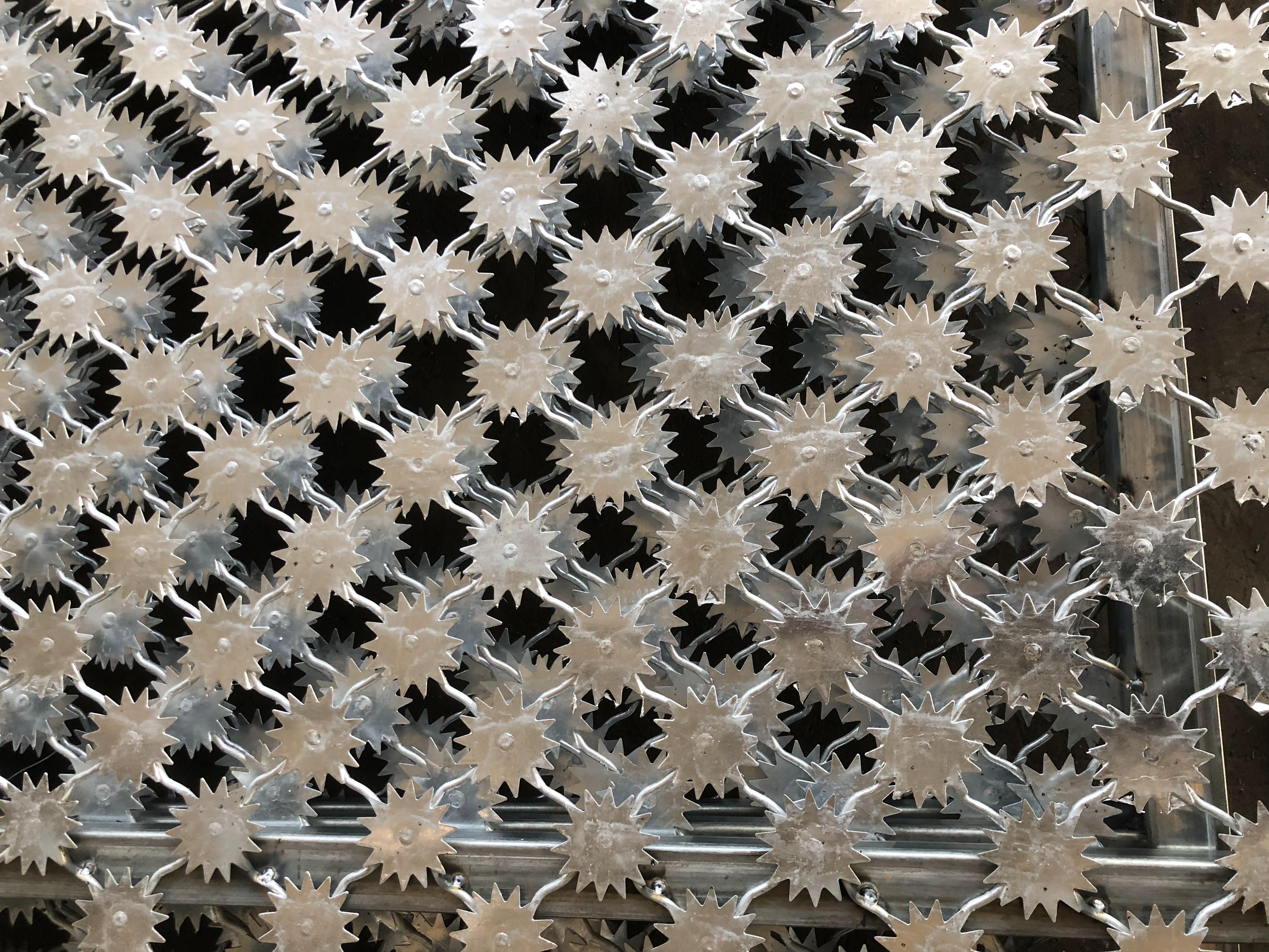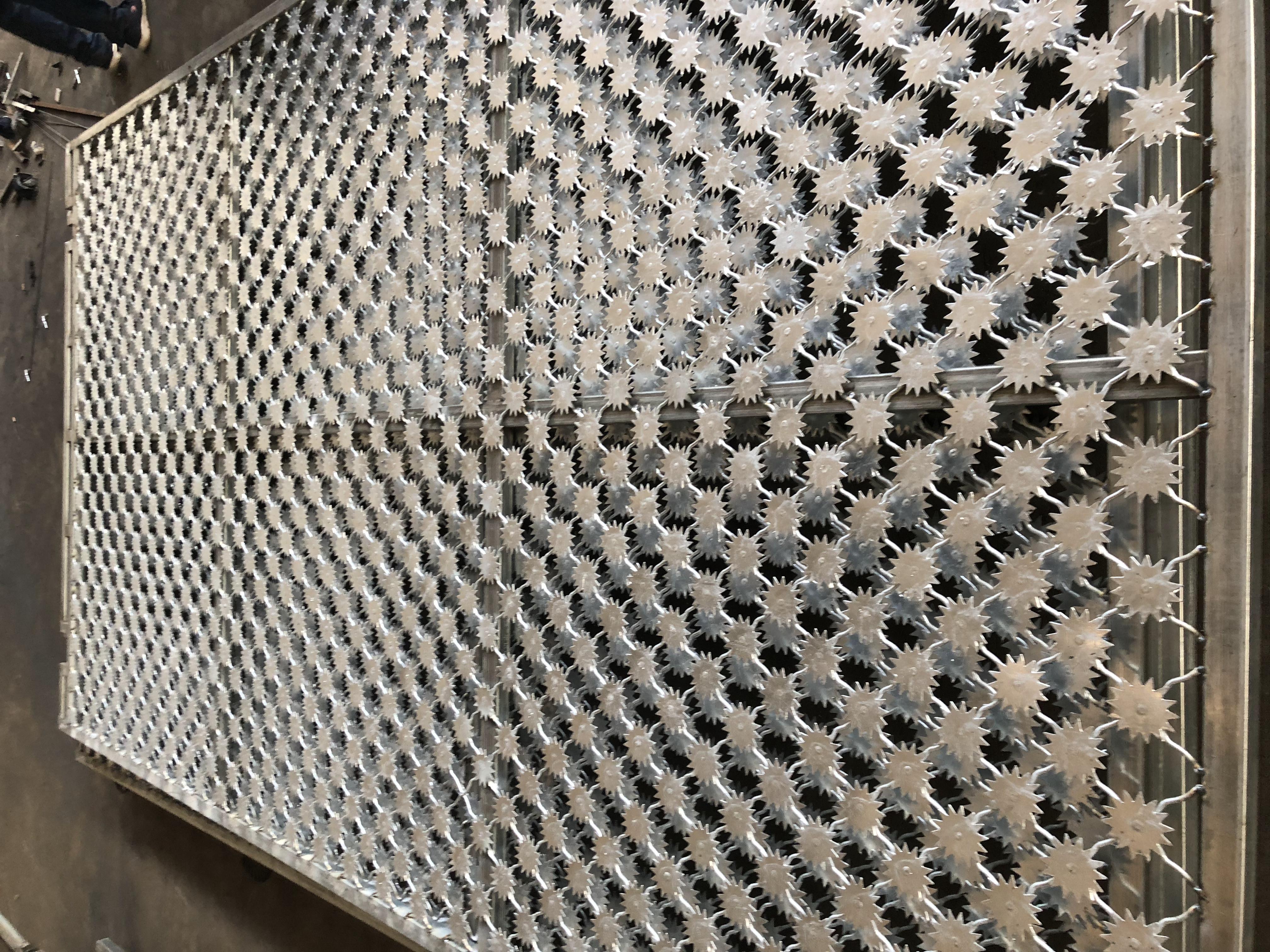 監(jiān)獄防沖撞網(wǎng)梅花刺鋼網(wǎng)墻的梅花刺形狀一般為各種不同角度的倒V字型或Z字型刺,刺的尖端非常銳利,以增加其防切割能力。梅花刺的刺距按照不同的需求可在5厘米到20厘米之間調(diào)節(jié),以實(shí)現(xiàn)不同的安防防范目標(biāo)。
