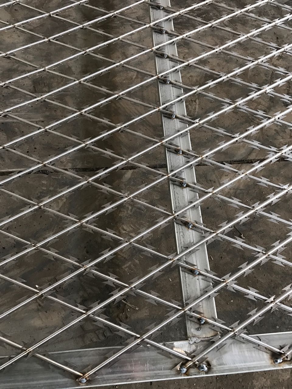 是由刀片刺繩直條焊接而成的,是根據(jù)電焊網(wǎng)片改進(jìn)而成,主要功能是防盜,防攀爬以及隔離。刀片刺繩網(wǎng)芯線上面有鋒利的刀片,手不能握防護(hù)性能好。因?yàn)樵蹅兊慕艿脑捤軐酉鄬?duì)要稍厚一點(diǎn),這樣會(huì)使咱們刀片刺網(wǎng)的刀片變鈍減弱了它的作用,因此不建議使用浸塑的處理方法。