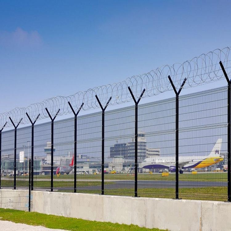 機場圍欄網(wǎng)又稱作“Y型安全防御護網(wǎng)”,是由V型支架立柱,加強型焊接片網(wǎng),安全防盜連接件和熱鍍鋅刀片刺籠組成強度和安全防御性級別很高。