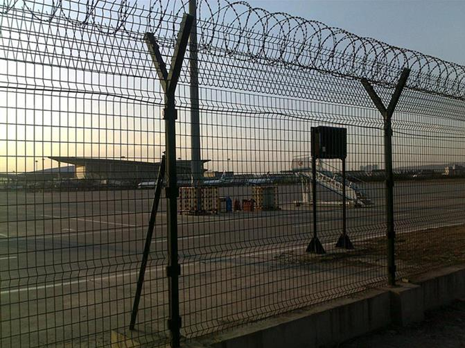 監(jiān)獄安全萬無一失。那機(jī)場(chǎng)圍界與監(jiān)獄隔離網(wǎng)有哪些共同點(diǎn)呢?下面小編來分析一下。機(jī)場(chǎng)圍界和監(jiān)獄隔離網(wǎng)又稱作“q型安全防御護(hù)網(wǎng)”,都是由折彎網(wǎng)片,v型支架立柱,加強(qiáng)型焊接片網(wǎng),上面有刀片刺繩(又稱刀刺網(wǎng),刀片護(hù)網(wǎng))安全防盜連接件組成強(qiáng)度和安全防御性級(jí)別很高。因立柱外形酷似英文字母Y,所以被稱為Y型安全防御護(hù)網(wǎng)。頂部加裝刀片刺絲、刀片刺網(wǎng)后又很好的增強(qiáng)了安全防護(hù)性能。產(chǎn)品造型美觀、花色多樣,既起到圍欄作用,又起到美化作用。由于具有安全性高、防攀爬能力好,網(wǎng)片連接方式采用特制SBS緊扣件,有效防止人為的破壞性拆卸,橫向2-4道折彎加強(qiáng)筋,使網(wǎng)面強(qiáng)度增加,每6米增加一根斜撐,這樣防風(fēng)性能也加強(qiáng)了。