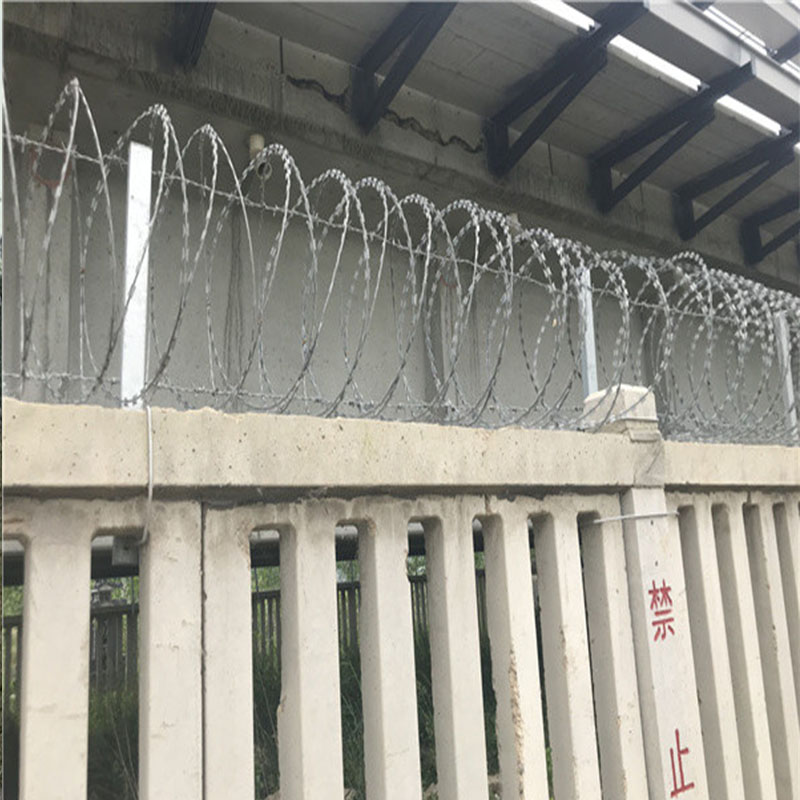 刀刺滾籠生產(chǎn)工藝 :刀片刺繩由熱鍍鋅板或不銹鋼薄板沖壓出尖銳的刀片狀,高張力鍍鋅鋼絲或者不銹鋼絲做芯線組合而成的防護(hù)產(chǎn)品,利用不銹鋼卡扣將刀片刺繩繞圈后相臨兩圈每隔120°用刺絲連接卡固定,張開(kāi)后形成蛇腹網(wǎng)狀,閉合后刀片刺繩 圈徑為50cm,張開(kāi)后每交叉圈安裝間距20cm,直徑不小于45cm。由于刺網(wǎng)造形獨(dú)特不易觸摸、形成立體圍護(hù)因而能達(dá)到極好的防護(hù)隔離效果,該產(chǎn)品具有嚇阻效果好、美觀、施工便利、線型可隨地勢(shì)變換、經(jīng)濟(jì)實(shí)用等優(yōu)異特點(diǎn)。