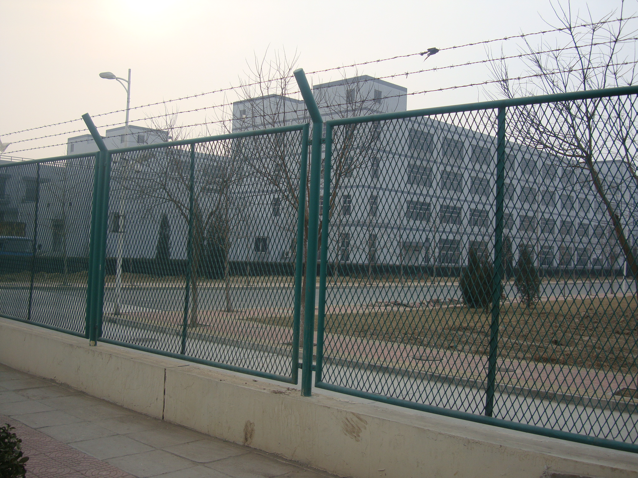 金屬護(hù)欄網(wǎng)圍墻一般采用低碳鋼絲作為主要材料,具有耐腐蝕、耐磨損、抗拉強(qiáng)度高等特點(diǎn),采用框架結(jié)構(gòu),邊框可使用方管、圓管或角鋼,立柱采用Y型立柱,頂部安裝防爬刀刺網(wǎng),高度也可根據(jù)現(xiàn)場(chǎng)要求定制,以確保足夠的防護(hù)效果。包括頂部應(yīng)設(shè)置的刀刺網(wǎng),以有效防止人員攀爬。這種架構(gòu)形式能提供更好的視野和通風(fēng)效果。邊框網(wǎng)結(jié)構(gòu)相對(duì)于磚墻來說具有更大的網(wǎng)眼和更少的遮擋物,能夠提供更好的視野和通風(fēng)效果,使得環(huán)境更加明亮和通風(fēng)。