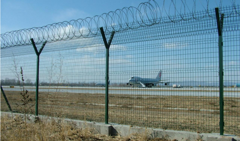機(jī)場護(hù)欄網(wǎng)都有什么樣的特點(diǎn)呢,機(jī)場護(hù)欄網(wǎng)能起到很好的防護(hù)作用,機(jī)場護(hù)欄網(wǎng)又稱作“Y型安全防御護(hù)網(wǎng)”機(jī)場隔離網(wǎng)、機(jī)場圍欄網(wǎng),是由V型支架立柱加強(qiáng)型焊接片網(wǎng),安全防盜聯(lián)接件和熱鍍鋅刀片刺網(wǎng)組成強(qiáng)度和安全防御性級別很高。被廣泛應(yīng)用在機(jī)場,軍事基地等高安全場所。