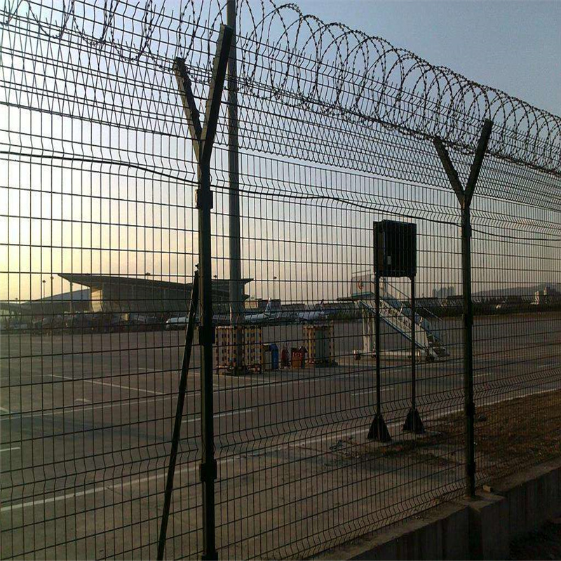 機(jī)場圍界網(wǎng)常用規(guī)格材質(zhì):優(yōu)質(zhì)低碳鋼絲;鋼管/角鋼線材:采用高強(qiáng)度低碳鋼絲焊接或高強(qiáng)度鋁包鋼絲編織而成;網(wǎng)孔:50*50mm,50*100mm,50*200mm網(wǎng)片帶有V型加強(qiáng)槽,可大大增強(qiáng)鋼筋網(wǎng)圍界的抗沖擊力。邊框:方管或角鋼焊接而成;立柱:60*80mm,80*80mm,80*100mm,100*100mm等矩形鋼,頂部焊有V型之架,用以架設(shè)蛇腹形刀刺網(wǎng).