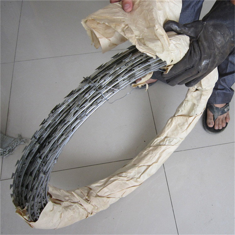 2、平板式刀片刺絲是刀片刺絲的一種新的應用方式,它是將單圈式刀片刺網(wǎng)平壓成板狀,或將兩件單圈刺網(wǎng)壓平后交叉相錯使用,外表美觀而且實用,可與直線式刀片刺絲搭配使用,構成下直線上平板的防護墻,或僅用平板式刺絲構成防護墻。主要適用于小區(qū)、倉庫、畜牧廠、農(nóng)場、礦山、監(jiān)獄、國防重地等。