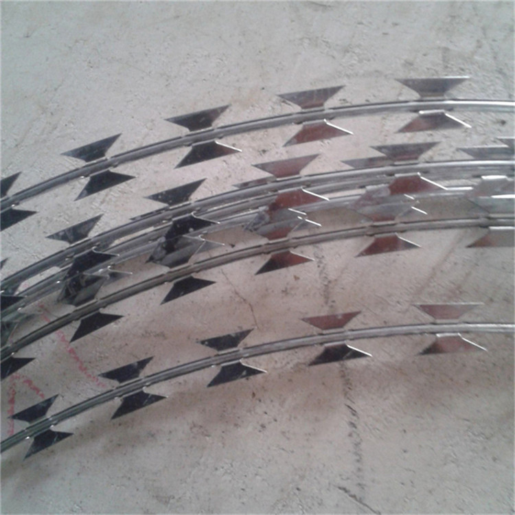 螺旋型交叉式刀片刺絲是在兩條刀片刺絲之間以不銹鋼片和鍍鋅鋼片強力夾和,展開后即成交叉狀,取其美觀又實用。