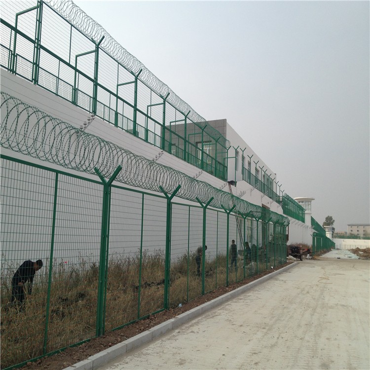 (5)監(jiān)獄防攀爬金屬隔離網(wǎng)隔離網(wǎng)及大門全部材料需采用熱鍍鋅處理,之后采用面漆進行表面處理,用氟碳漆噴涂兩邊(額色由甲方確定),確保涂層10年無脫落起皮現(xiàn)象。漆層表面應無氣泡和其他雜質(zhì),電鍍層色澤勻稱,鍍層無脫落。隔離網(wǎng)網(wǎng)頁安裝離地距離5.8cm,框網(wǎng)與立柱采用螺栓固定邊耳式連接網(wǎng)頁每邊與立柱連接點不少于8處。