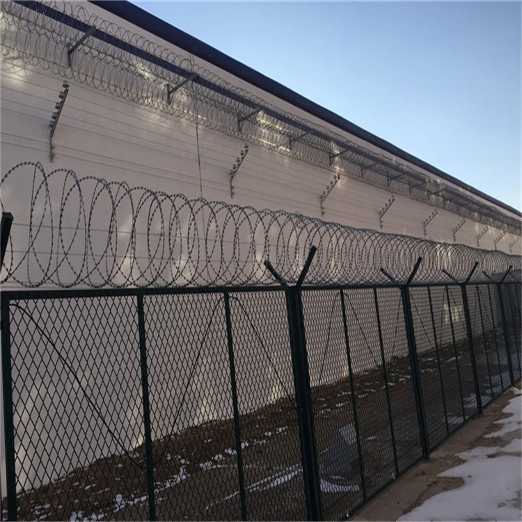 (4)蛇腹型刀刺網(wǎng)與V型托網(wǎng)之間用適量固定卡子或用2-3條直徑3.0m不銹鋼絲加固,鋼絲穿過V型托(預留孔)拉直固定刀刺分布均勻,距離<15cm;分段連接處需將兩端刀刺網(wǎng)做連接固定,刀刺網(wǎng)固定點需緊鎖,不得出現(xiàn)松動、脫落觀象;上下左右均威直線延伸,轉(zhuǎn)角處需做加密加固處理。
