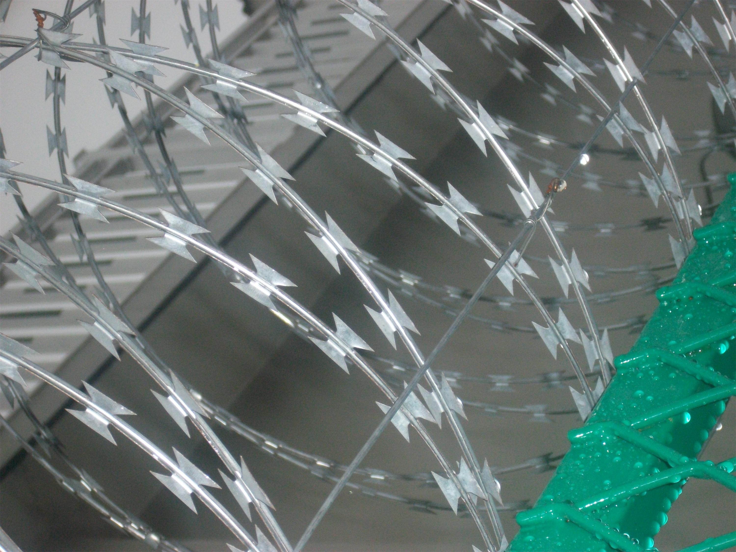 斧型刺刀圈的產(chǎn)品知識是一種新型防護網(wǎng),由銳利尖角刀片和芯線組成,刀刺、刀型整文、刀片銳利、排列均夕致密、連接牢固。強度和安全防御性級別很高,鋼筋網(wǎng)圍界刺鋼絲采用斧型刺刀圈,刺刀圈內(nèi)芯為直徑2.5mm的冷拔低碳鋼絲并經(jīng)防腐處理,表面熱鍍鋅。安裝刺刀圈與頂部V形延伸警用不銹鋼卡子連接,沿長度方向每隔500mm設4個卡子連接,拉強度大于1450N/mm,特點:刀型整齊斧型刺刀圈規(guī)格: 刀片為BTO-22刀型,直徑為50、60cm、70cm,刀片鋒利,排列均勻、致密,連接牢固,防腐能力強、可達到防翻躍、防拆卸高安全防護等級。
