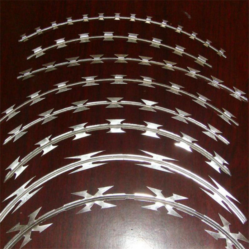 刀片刺網大概分為螺旋型、直線型、螺旋穿插型三種方式,刀片刺網由熱鍍鋅鋼板或不銹鋼薄板沖壓出尖利的刀片狀,高張力鍍鋅鋼絲或許不銹鋼絲做芯線組合而成的阻絕器件。由于刺網造形共同不易接觸,因而能到達極好的防護阻隔作用。產品的主要原料有鍍鋅板和不銹鋼板。刀片刺繩依照安裝辦法不同可分為:(蛇腹式)螺旋式刀片刺繩,直線型刀片刺繩,平板式刀片刺繩,刀片刺繩焊接網等。