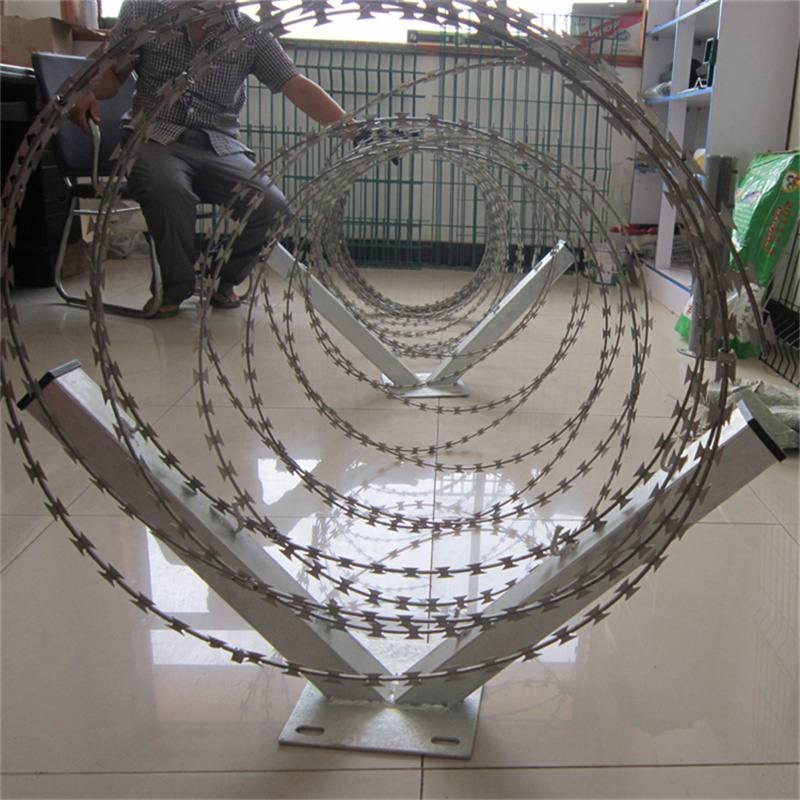 刀片刺繩在安裝過程中,可以根據(jù)圍墻的長度實際使用多少根Y字型支架,一般為3-4米為宜,把Y型支架固定在墻的上面,其中Y型支架可根據(jù)實際情況進(jìn)行打孔,從而安裝刺網(wǎng)的時候,起到固定作用。之后,在刀片刺網(wǎng)的Y型支架兩側(cè)各拉一根鋼絲,對刺網(wǎng)進(jìn)行固定,避免左右晃。安裝刀片刺繩的時候要注意的事項也是很多的,但是首先要注意的是自身安全,由于刀片刺繩刀口設(shè)計的原因遭到割傷后傷口不好愈合,所以在安裝時要先保證自身的安全。首先一副比較厚的勞保手套是必不可少的,因為之前客戶反映過說用普通手套結(jié)果割破了兩雙,所以為了保護(hù)咱們的雙手受到不必要的傷害,一定要帶好手套防止受傷。其次刀片刺繩安裝時需要兩個人同時進(jìn)行安裝防止一個人安裝時由于回彈導(dǎo)致受傷。