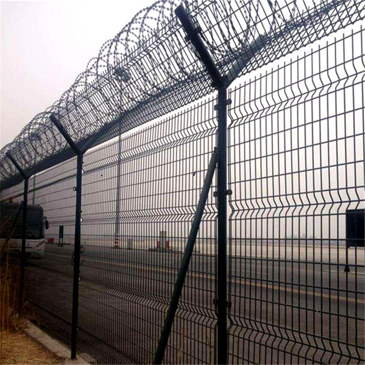 特點(diǎn):如果在機(jī)場護(hù)欄網(wǎng)頂部加裝刀片刺絲、刀片刺繩后又很好的增強(qiáng)了安全防護(hù)性能。采用電鍍、熱鍍、噴塑、浸塑等防腐形式,具有很好的抗老化、抗曬、耐候等特點(diǎn)。其產(chǎn)品造型美觀、花色多樣,既起到圍欄作用,又起到美化作用。由于具有安全性高、防攀爬能力好,網(wǎng)片連接方式采用特制SBS緊扣件,有效防止人為的破壞性拆卸,橫向四道折彎加強(qiáng)筋,使網(wǎng)面強(qiáng)度顯著增加。
