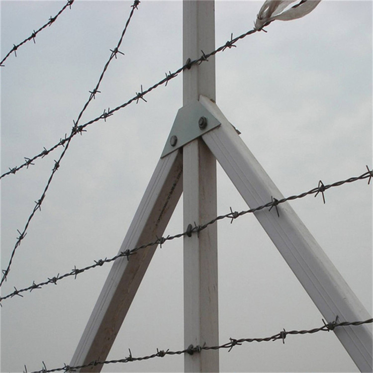 4)刺鋼絲安裝時(shí)要從端頭立柱開始,刺鋼絲之間要平行、平直;繃緊后用鋼絲與立柱上的鉤扣綁扎固定,橫向與斜向刺鋼絲相交處也要用鋼絲綁扎。