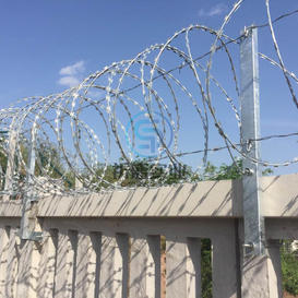 (1)、刺絲滾籠采用刀片刺繩繞圈后相臨兩圈每隔120°用刺絲連接卡固定,張開后形成蛇腹網狀,閉合后刀片刺繩圈徑為50cm,張開后每交叉圈安裝間距20cm,直徑不小于45cm。