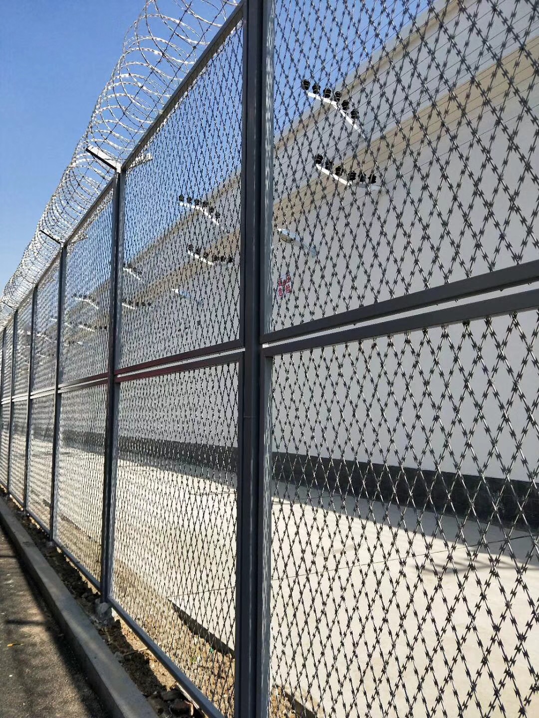 重罪犯生活區(qū)鋼網(wǎng)墻主體一般由網(wǎng)片、立柱和刀刺網(wǎng)三大部分組成。網(wǎng)片四周焊接邊框,以增加鋼網(wǎng)墻的防護強度,看守所鋼網(wǎng)墻的邊框和其它場地的邊框有所不同,網(wǎng)片中間可以加橫撐,以起到橫向支撐網(wǎng)子的作用,邊框左右兩側焊接連接網(wǎng)片,以便與兩側立柱連接。立柱焊接成Y字型,用以架設刀刺網(wǎng),與網(wǎng)片完美結合。比普通的金屬護欄網(wǎng)防護性能要高很多,這就要求在加工過程中選料、用料都要嚴格要求,一般網(wǎng)片采用Q235鋼材制作,絲徑不宜太細,要5mm絲及以上,防止認為破壞,所以稱鋼網(wǎng)墻,堅固結實、韌性大,硬度高形成一道難以逾越的鋼網(wǎng)墻。